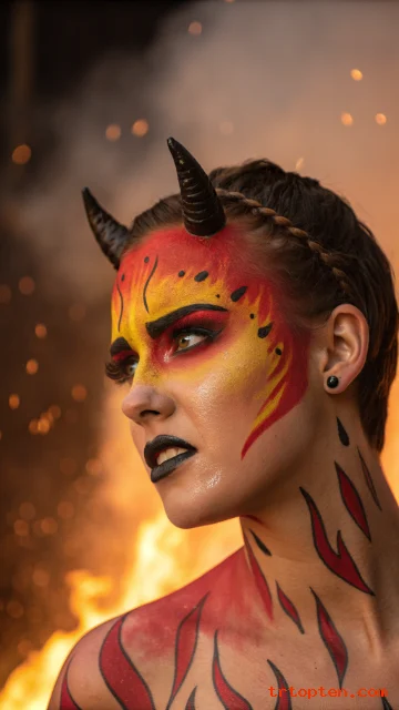 Draw flame shapes licking up from the neck and jawline using red, orange, and yellow face paints. Finish with black or deep burgundy lips and maybe small black horns on a headband.