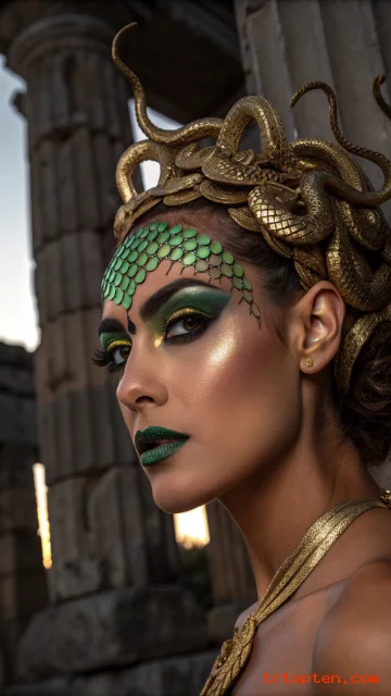 Medusa makeup turns you into a myth brought to life. Start with a bronzed base and strong contour to carve sharp cheekbones.
