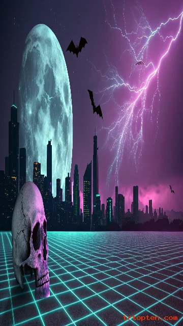 Use grid lines, lightning bolts, and glowing shapes in the background. These details copy the retro synthwave style.