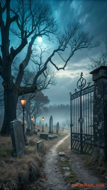 A graveyard scene wallpaper sets a strong horror tone. Tombstones, iron gates, and fog create a classic spooky setup.