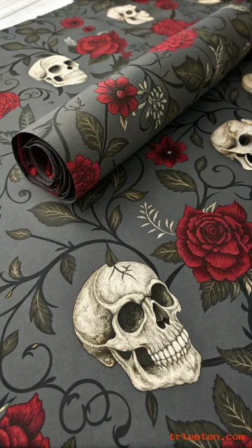 Gothic floral wallpaper with skulls blends romance and darkness. Roses, peonies, and vines wrap around detailed skulls for a dramatic effect.