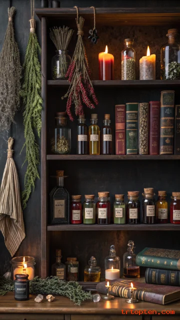A potion shelf wallpaper turns your wall into a witch’s workshop. Bottles, jars, and books line up in neat rows.