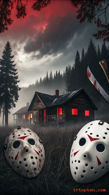 Think creepy cabins, old knives, masks, and stormy scenes layered together. Slight film grain adds a retro touch.