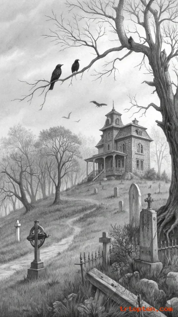 Use scenes of ravens, old mansions, graveyards, and twisted trees. Keep everything in detailed monochrome.