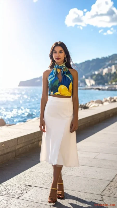 A lemon print dress leans into the famous coastal vibe. It feels fun, bright, and perfect for vacation photos. Choose a print that is clear but not too crowded.