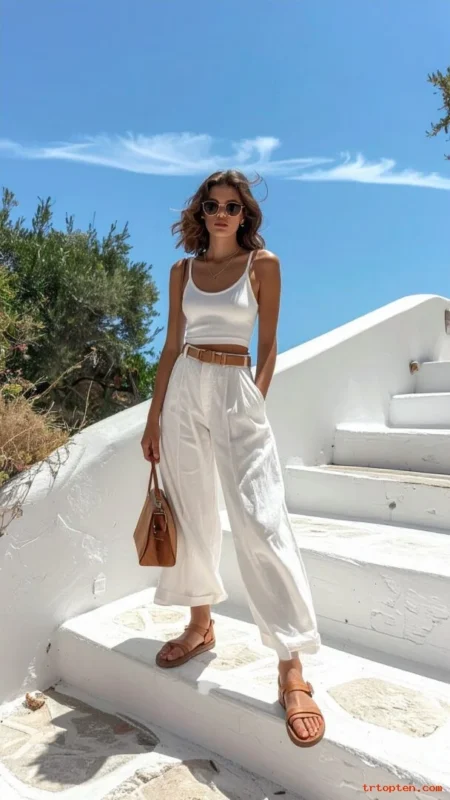 An all-white look feels fresh in the Italian sun. It looks great against colorful buildings and blue water. Choose breathable fabrics so the outfit stays comfortable.