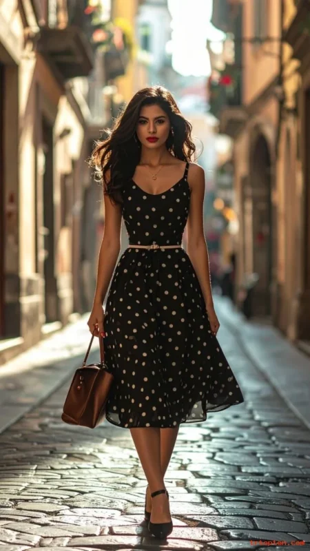 A polka dot midi dress feels classic and romantic. It fits Italian streets and timeless travel photos. Choose small dots for a refined look.