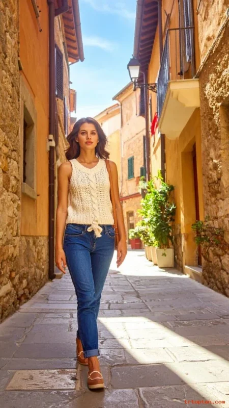 A sleeveless knit top adds structure without heat. It looks polished and holds shape in travel photos. Choose a light knit in cream, black, or navy.