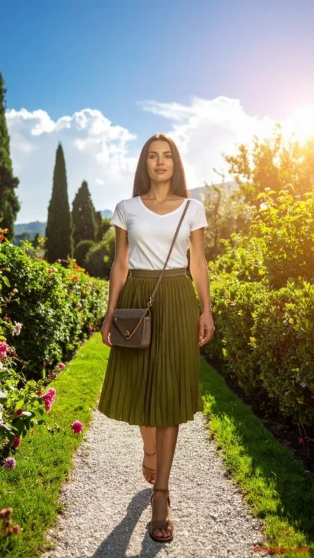 A white tee keeps the outfit relaxed and easy. A pleated skirt adds movement and makes the look feel dressed up. This mix fits Italian summer outfits because it balances casual and chic.