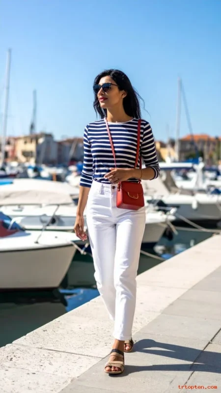 A striped Breton top and white jeans look fresh and timeless. This combo matches the Italian summer outfits vibe because it feels coastal but still city-ready. Keep the stripes narrow for a sleek look.
