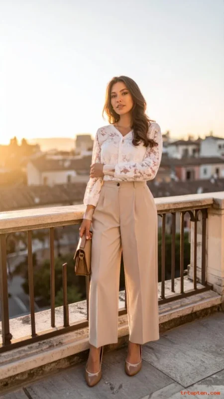 A lace top adds romance without heavy layers. It suits Italian summer outfits for evening walks and aperitivo time. Choose a lace pattern that looks delicate and clean.