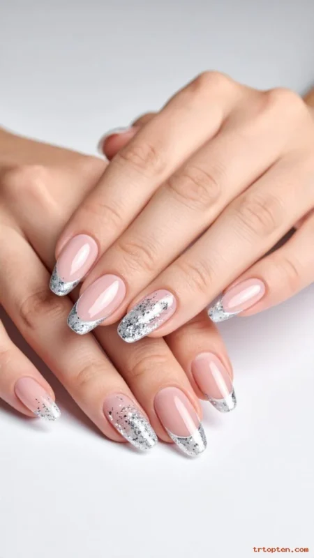 Choose fine silver glitter for a smooth line. Keep the base sheer nude so it stays natural. Seal with glossy to lock the sparkle.