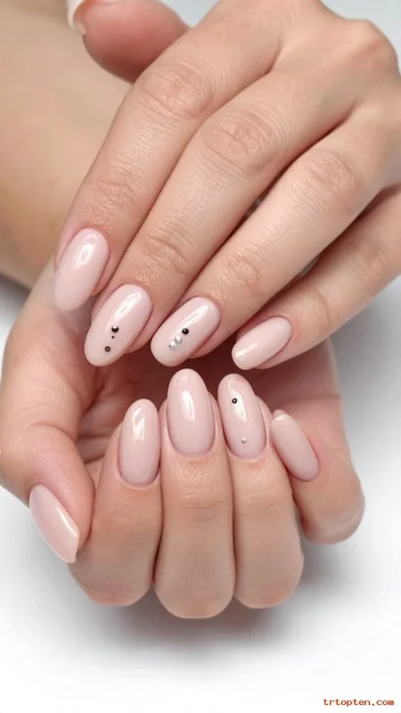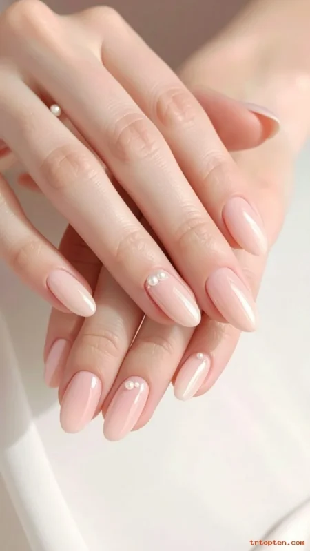 Paint nails in soft pink or milky white and add tiny pearls. Place pearls near the cuticle or in a small cluster on one accent nail. Keep placement tidy so it feels elegant.