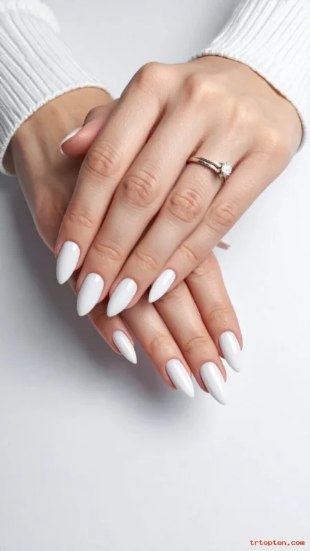 Milky white nails look soft, bright, and winter-perfect. The color looks clean without being stark. It also makes nails look longer.