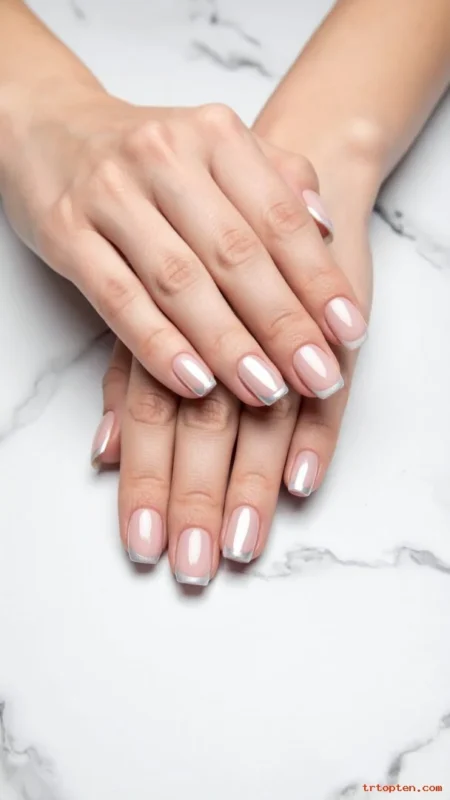 Choose a slightly thicker tip than a micro French for more impact. Keep the curve even across all nails. A glossy seal helps the chrome look mirror-smooth.