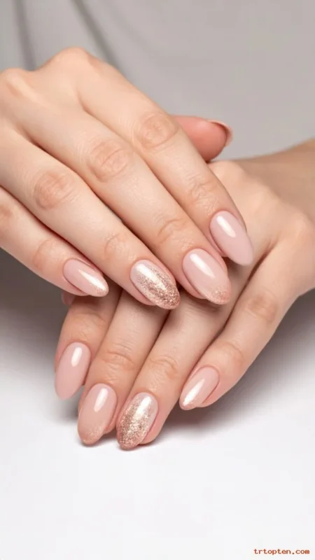 Apply champagne glitter from the tip and fade it down. Keep the base sheer nude so the glitter looks soft. This gives sparkle without feeling heavy.