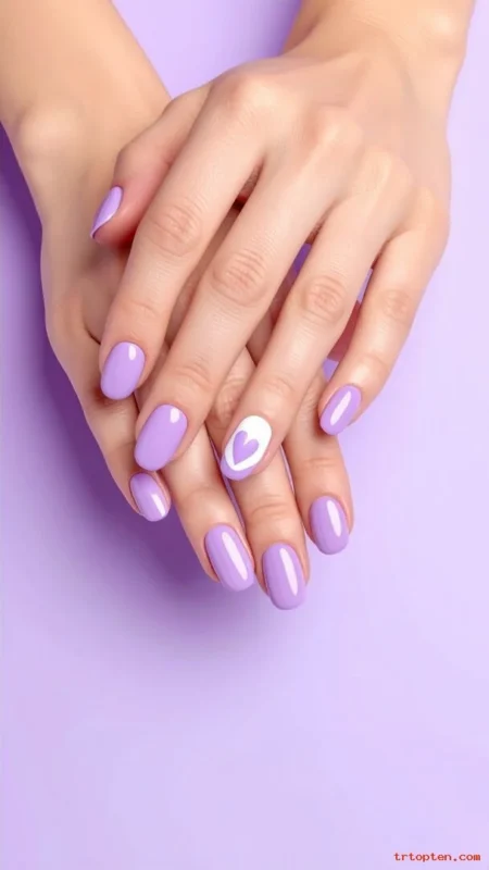 Add one white accent nail with a tiny lavender heart or star. Keep the accent small and clean. Finish with glossy for a candy-like shine.