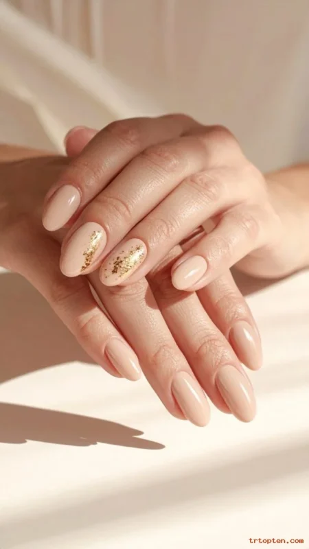 Use a nude base close to your skin tone. Add small gold flakes on two accent nails. Keep the flakes sparse for a refined look.