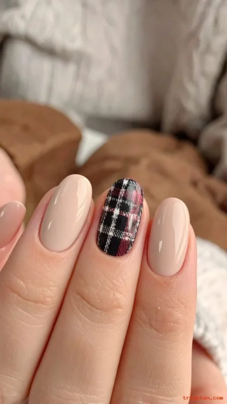 Paint most nails in a neutral shade like beige or gray. Add a plaid accent nail using thin lines in black, white, and a hint of red. Keep the plaid tight and neat.