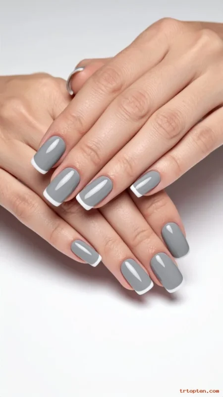 Paint nails in matte stone gray for a modern winter base. Add glossy tips in the same color for a subtle contrast. The finish change creates interest without extra colors.