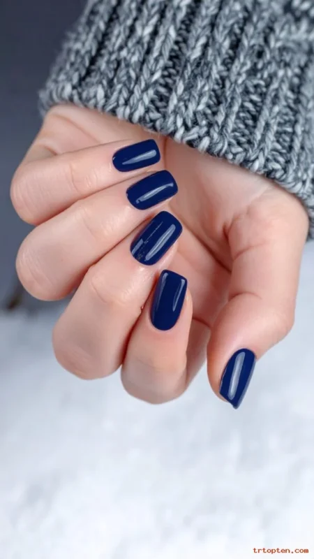 Choose a deep navy polish for a calm, dark winter shade. It feels softer than black but still bold. Keep the shape neat for a clean finish.