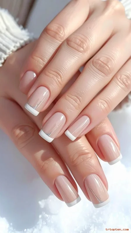 Do a classic French tip in white, then add a thin glitter line under the tip. The glitter line creates a crisp border. It looks festive but still winter-clean.