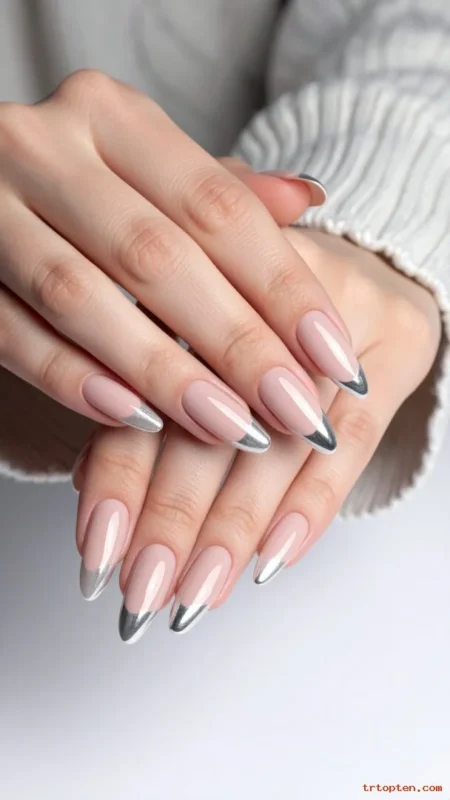 Use a nude base and add silver chrome just on the tips. The metallic edge looks sharp and luxe without covering the whole nail. This makes it easy to wear all month.