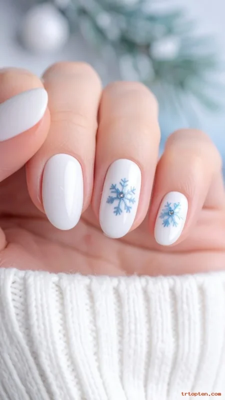 Paint most nails in milky white and add one snowflake accent on each hand. Use a pale blue or silver for the snowflake so it pops softly. Keep the rest simple so the art stands out.