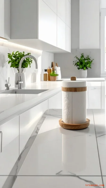 A wood or matte metal holder looks polished. Place it near the sink for real use. Keep the roll fresh and aligned so it looks neat.