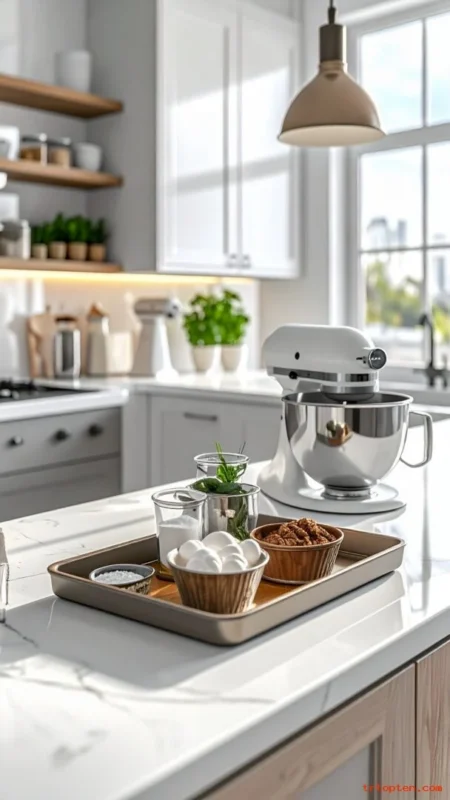 If you bake often, group tools in a tray near the mixer. It keeps measuring cups and vanilla in one spot.