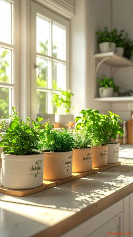 Use matching planters and label each herb. Keep a small watering can nearby but off the main counter zone.