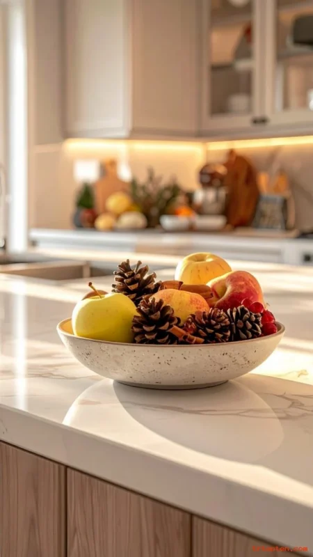 Choose a bowl that matches your kitchen style, like ceramic or wood. Keep the fruit fresh so the counter stays inviting.