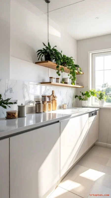 Flowers bring life to the kitchen without taking much space. A simple vase looks clean and bright.