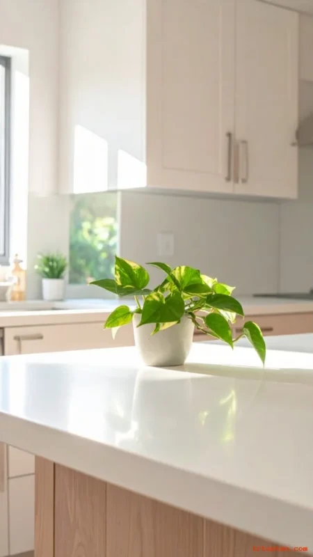 A plant softens hard surfaces like stone and tile. It adds color without making the counter feel crowded.