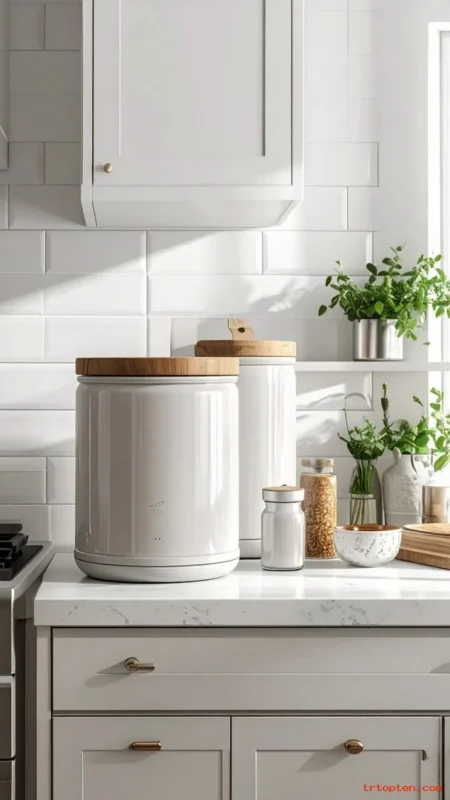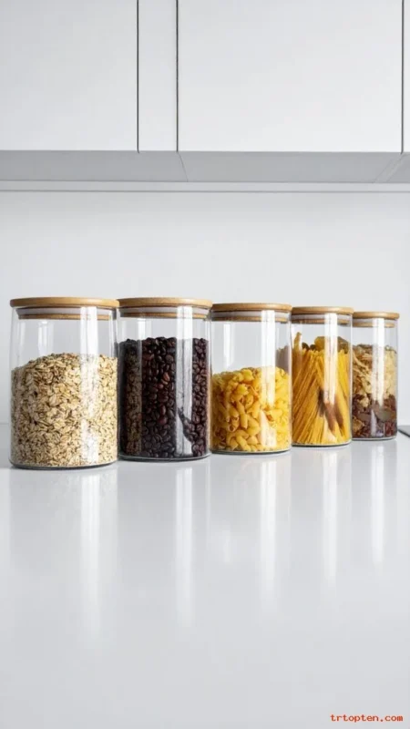 Use matching lids to keep the counter cohesive. Fill them with pasta, oats, or coffee beans for simple texture.