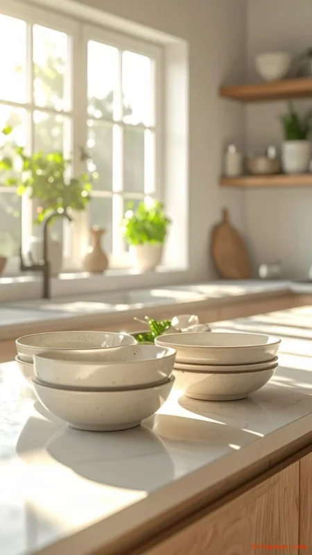 A bowl stack adds a casual, homey feel. It can also serve as a quick grab for snacks or prep.