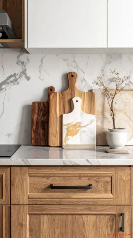 Mix wood tones and one marble board for contrast. Place a small crock in front for balance. Keep the stack tight so it looks intentional.