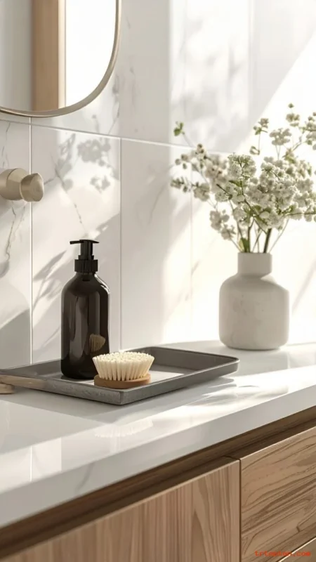Choose a soft scent and a neutral label for a clean look. Keep the setup minimal so the sink area feels open.