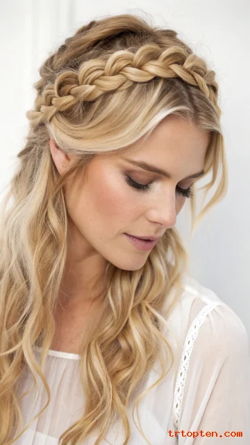 A blonde braided crown looks romantic and highlights dimension in the color. The braids show light and shadow in a pretty way. This style is great for events and photos.