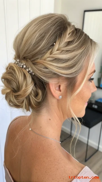 Create a low bun or twisted updo and leave a few strands around the temples. Use a texturizing spray for grip and volume. Pin securely and finish with a light mist of hairspray.