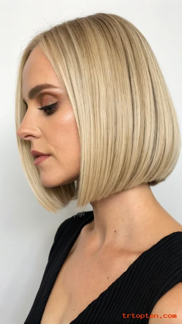 Ask for a chin-to-collarbone bob with blunt ends and minimal layers. Choose a neutral blonde to keep the look polished. Use a straightener for a crisp line and shine spray for gloss.