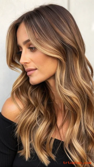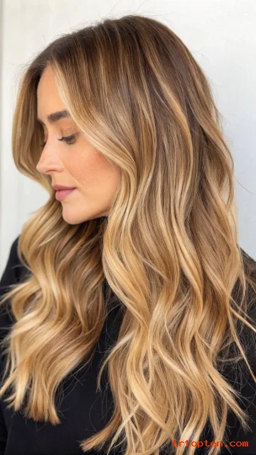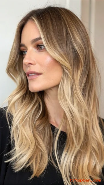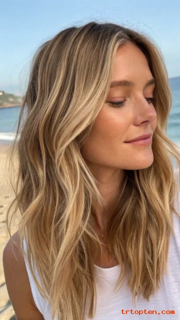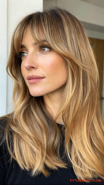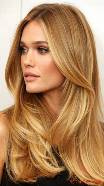 Choose a golden tone that leans warm, not brassy. Ask for long layers that start below the cheekbones for a soft face frame. Style with a round brush and a heat protectant for bounce.