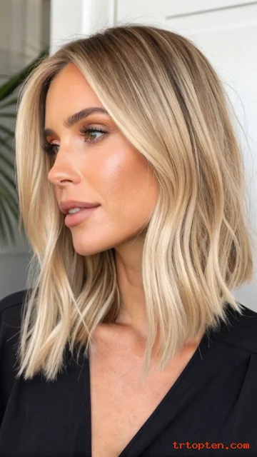 Pick a champagne tone with a hint of warmth to avoid a flat look. Keep the lob blunt with slight texture at the ends for movement. Style with a flat iron bend for a relaxed finish.