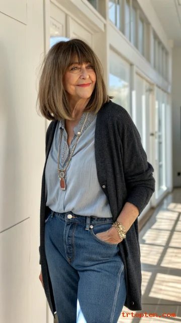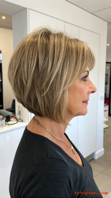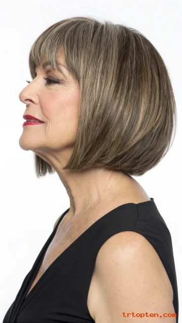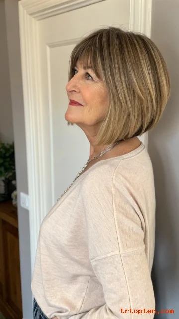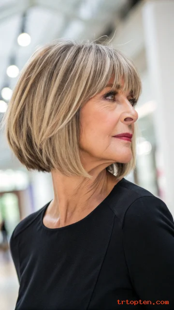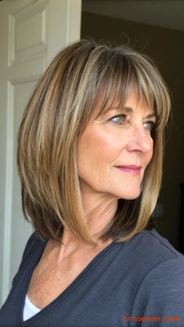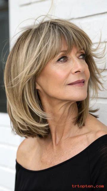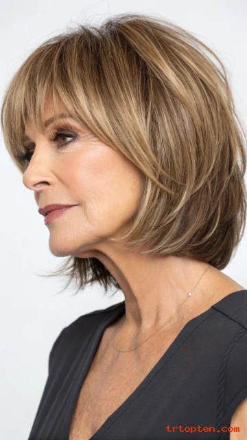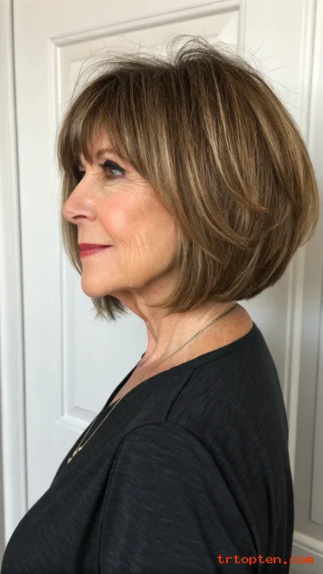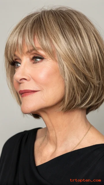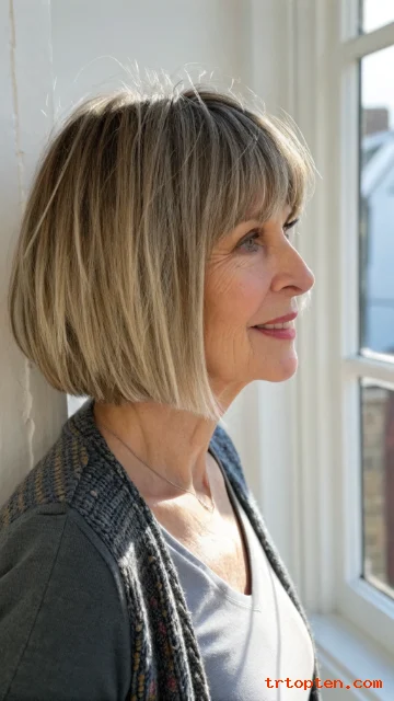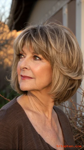 A layered bob with bangs over 50 can sharpen your features and soften fine lines at the same time. This haircut also adds lift at the crown, so hair looks fuller and more active.