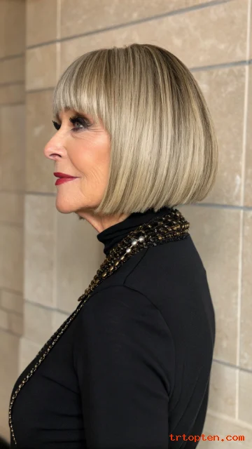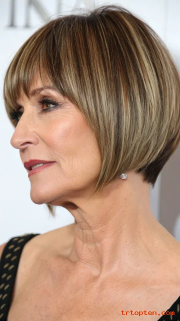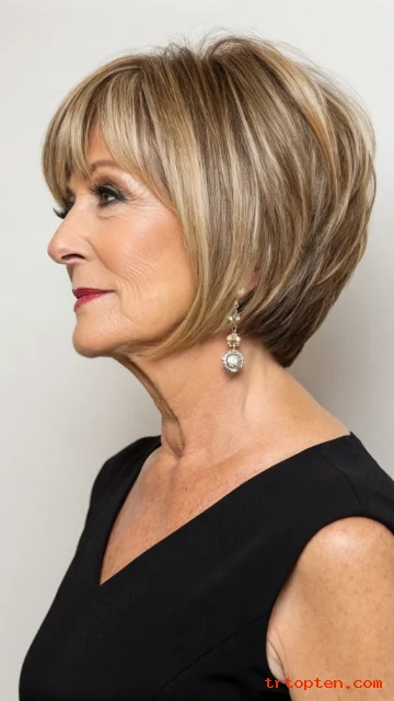 A stacked back builds volume where hair can look flat over time. Side-swept bangs draw attention to the eyes and cheekbones.