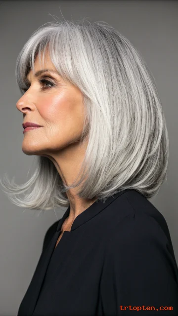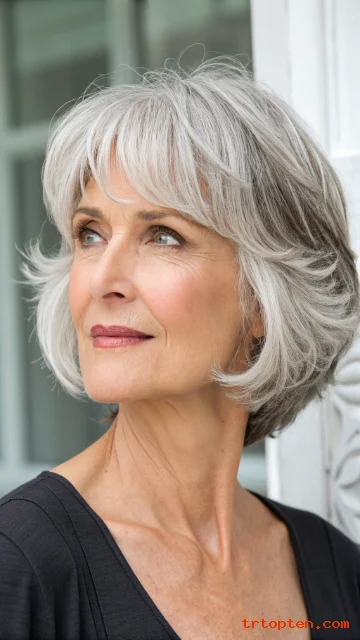 Natural gray hair looks striking with a clean, layered shape. Bangs soften the forehead and make the gray look intentional.