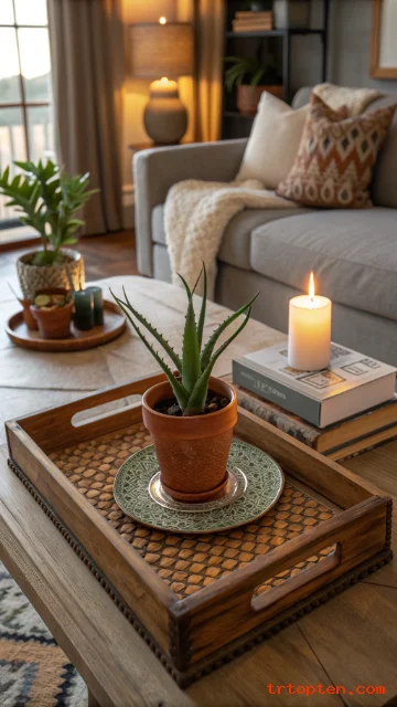 Use a low pot so the plant does not block sight lines. Pair it with a candle and a small book stack for a complete tray.