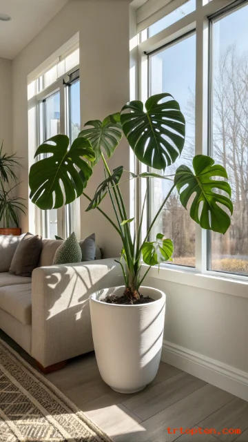 Place a tall Monstera near a bright window to create a bold green focal point. Use a wide ceramic pot to anchor the large leaves and keep the look calm.