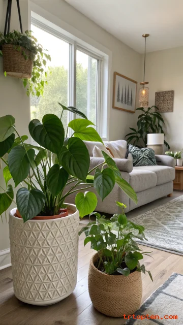 You can use height, leaf shape, and pot style to add color and texture without changing your furniture.