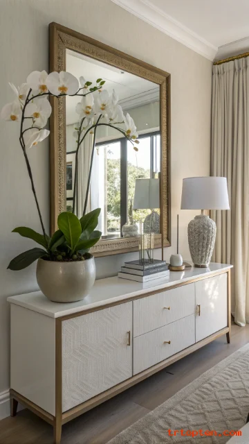 Add an orchid on a sideboard for a refined, simple color accent. The blooms look polished and suit modern rooms.